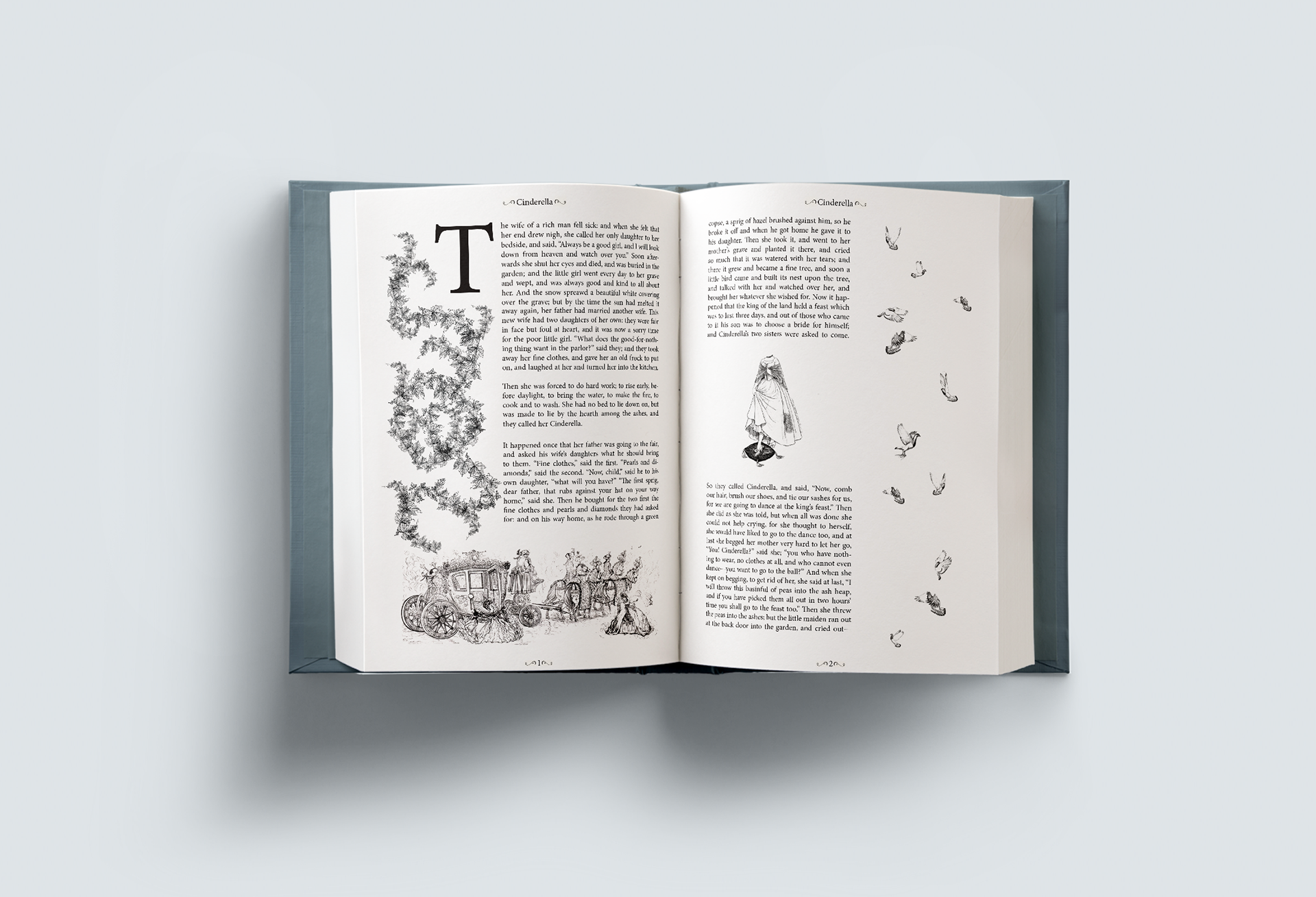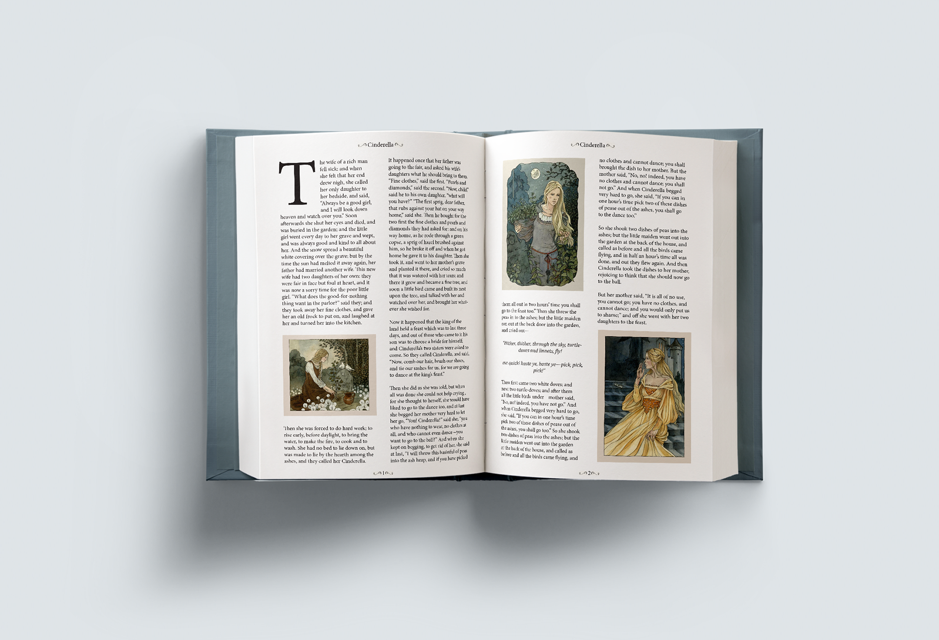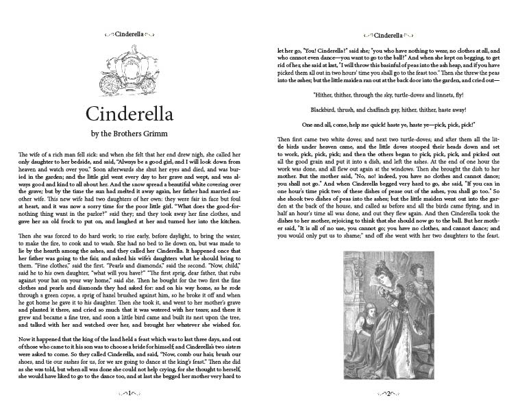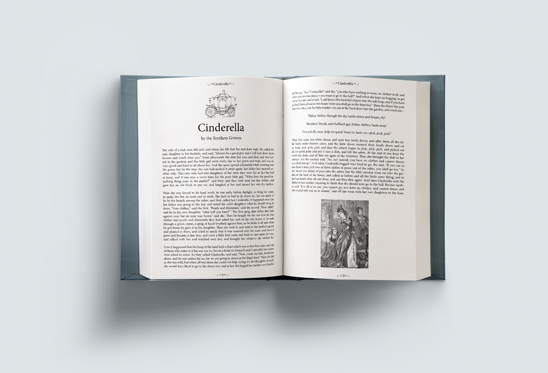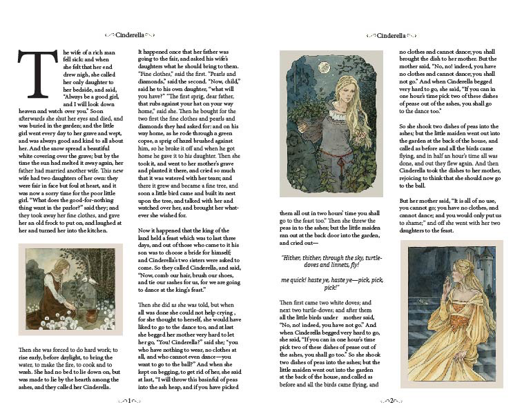 Three examples of page layout: column, modular, and manuscript. All in keeping with a similar fairy tale theme.